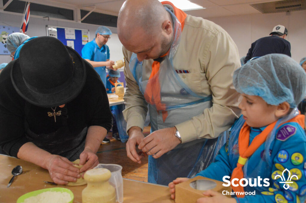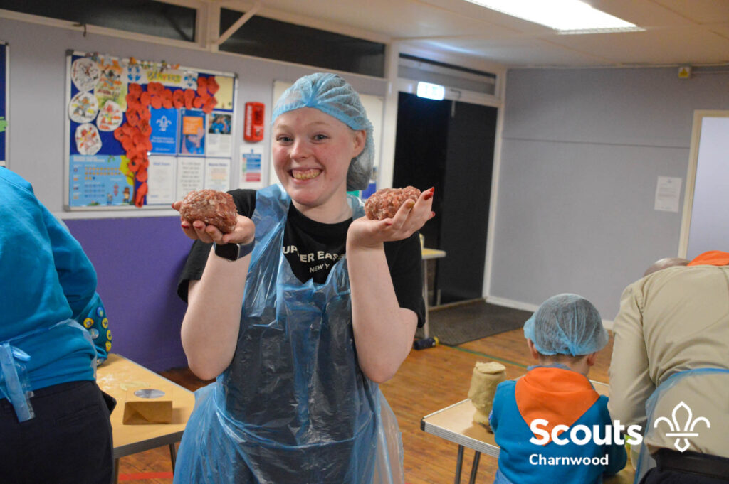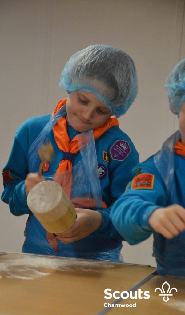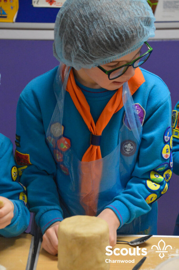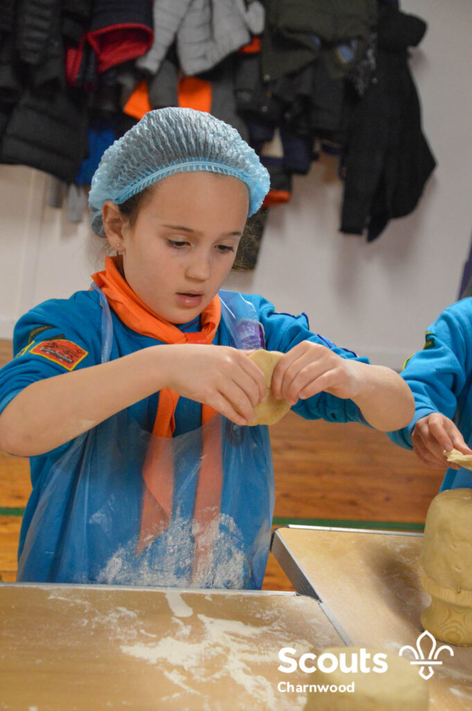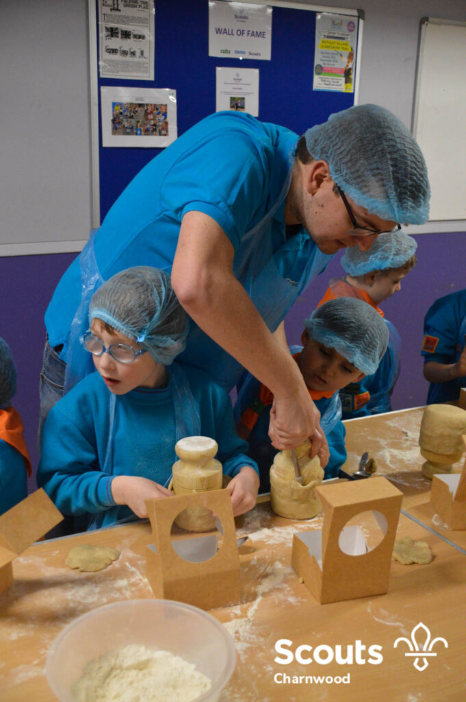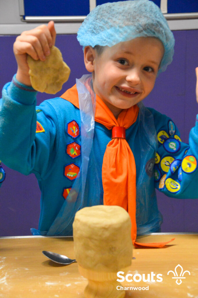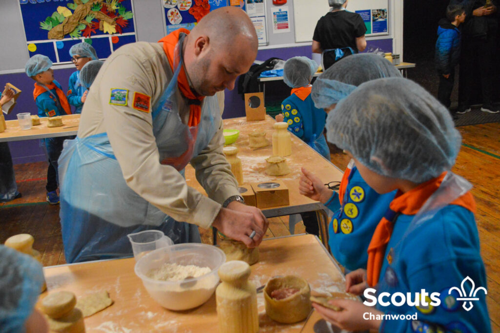 Under the expert guidance of Master Pie maker Claire the Beavers flowered the tables and moulded their pastry around a traditional dolly. Once they had successfully made their pie bases they were filled with local pork from Packington Free Range and pie lids put on.