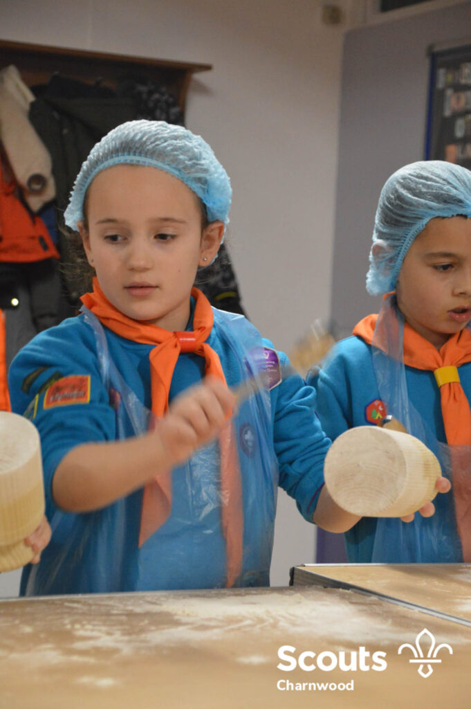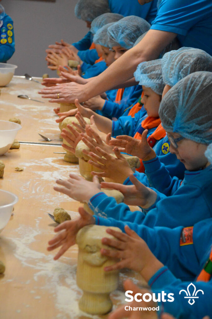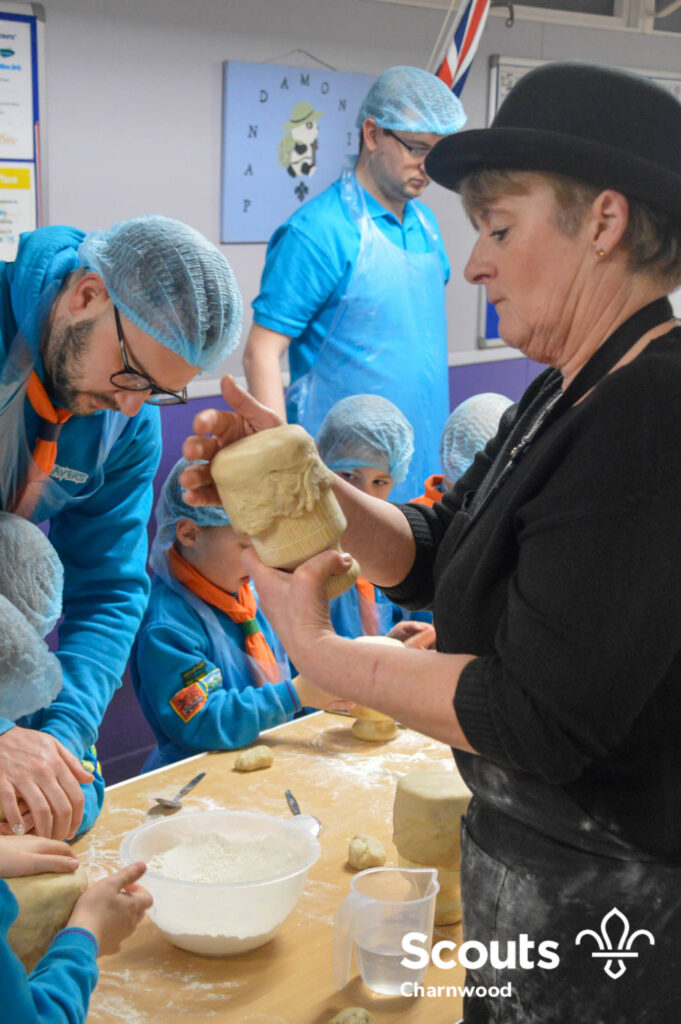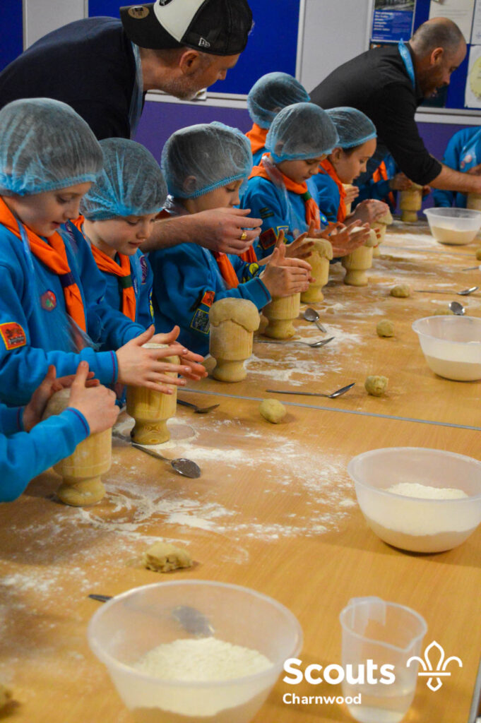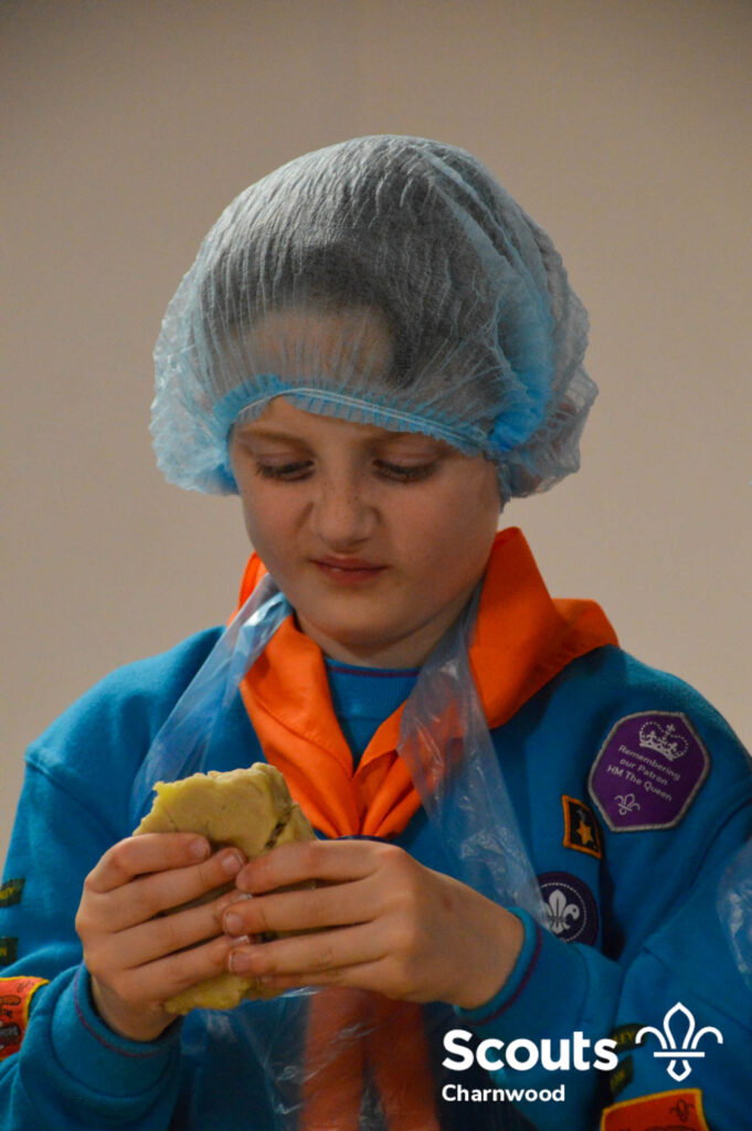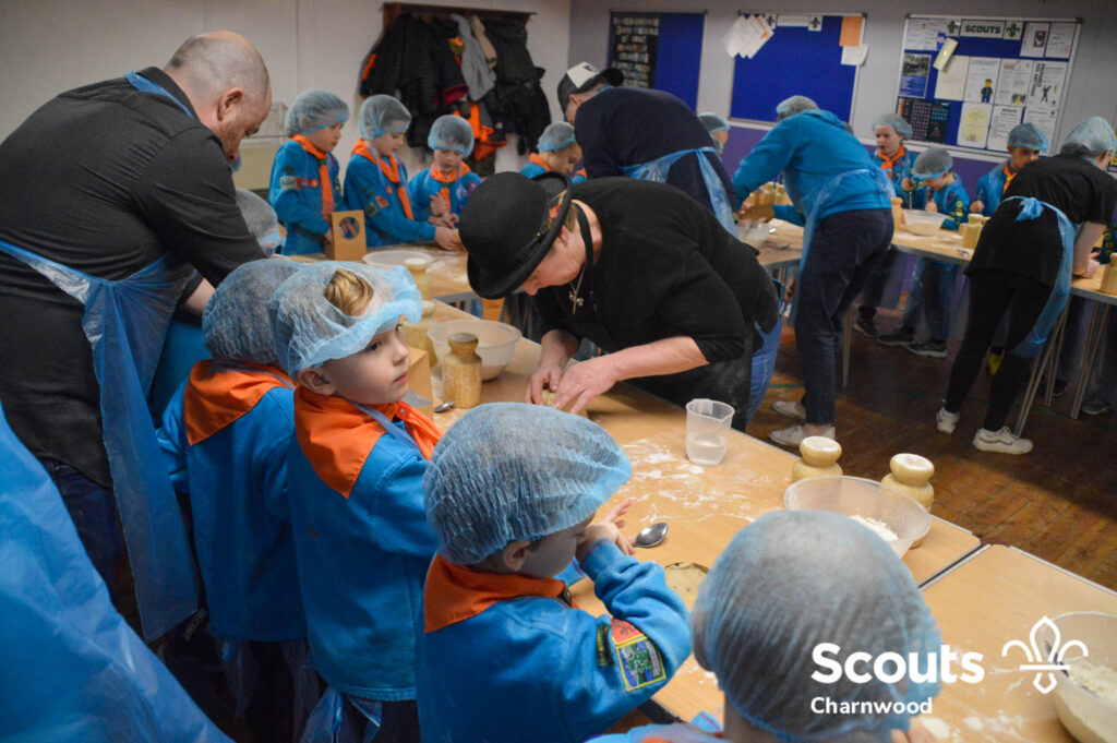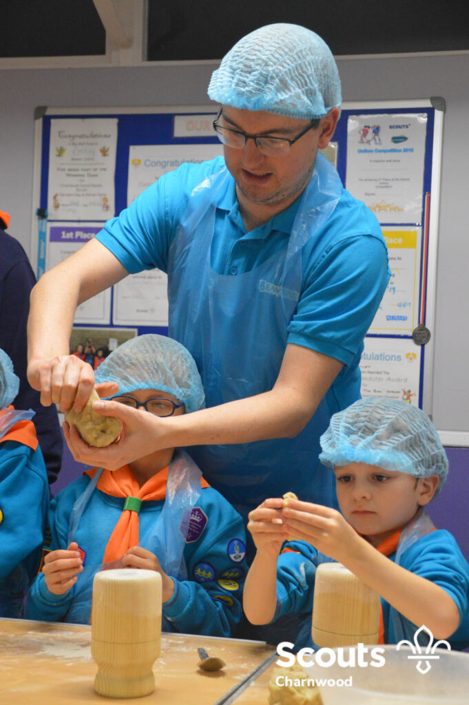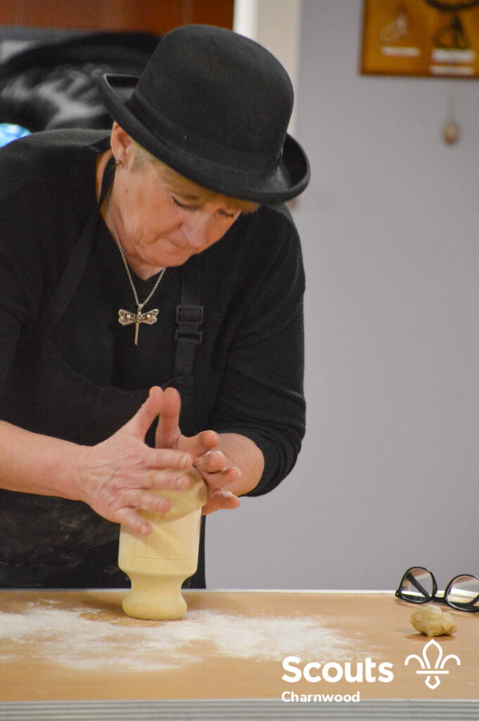 Under the expert guidance of Master Pie maker Claire the Beavers flowered the tables and moulded their pastry around a traditional dolly. Once they had successfully made their pie bases they were filled with local pork from Packington Free Range and pie lids put on.