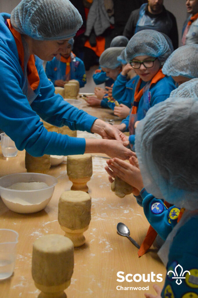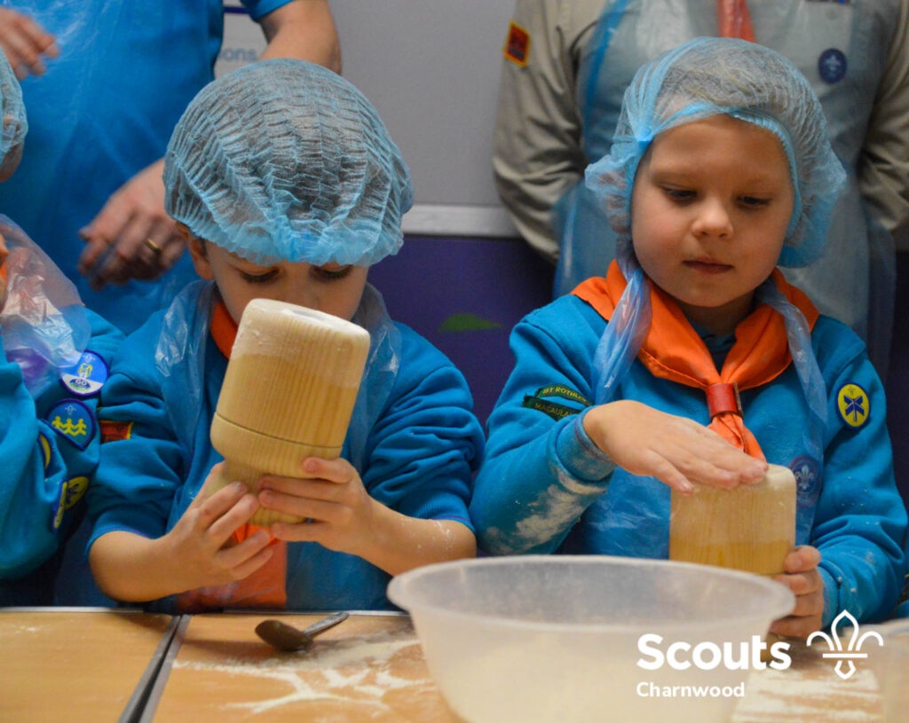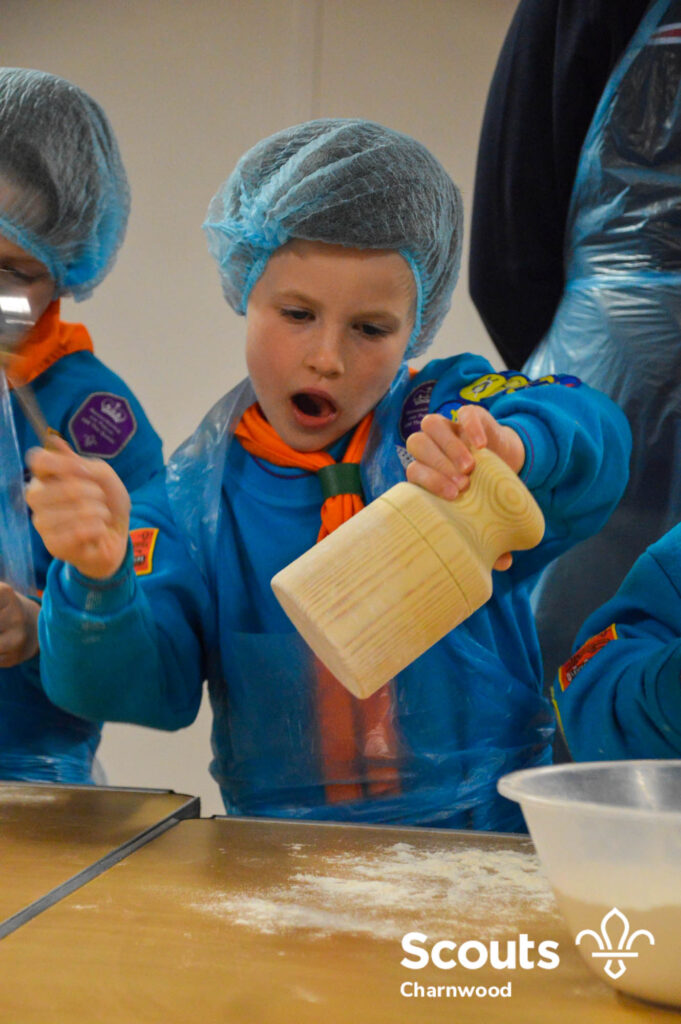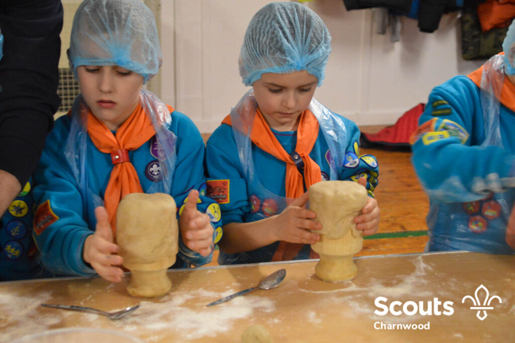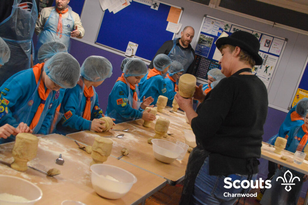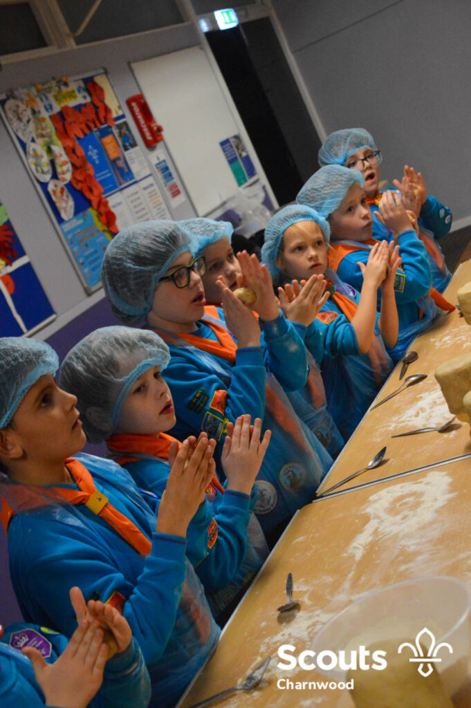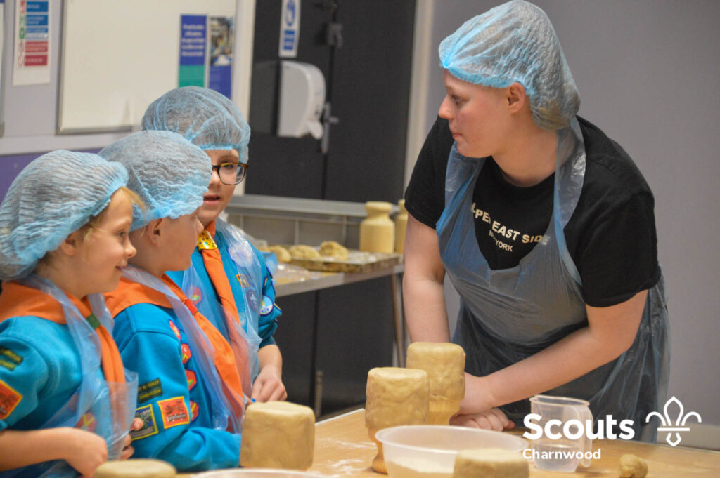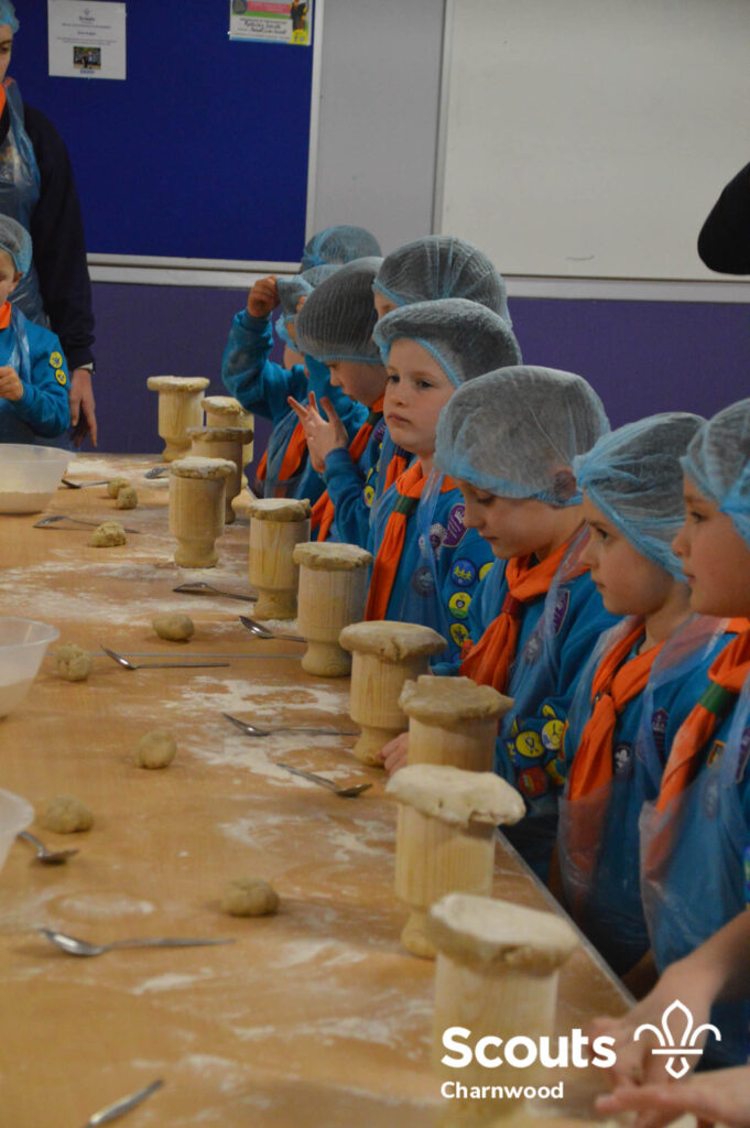 Under the expert guidance of Master Pie maker Claire the Beavers flowered the tables and moulded their pastry around a traditional dolly. Once they had successfully made their pie bases they were filled with local pork from Packington Free Range and pie lids put on.