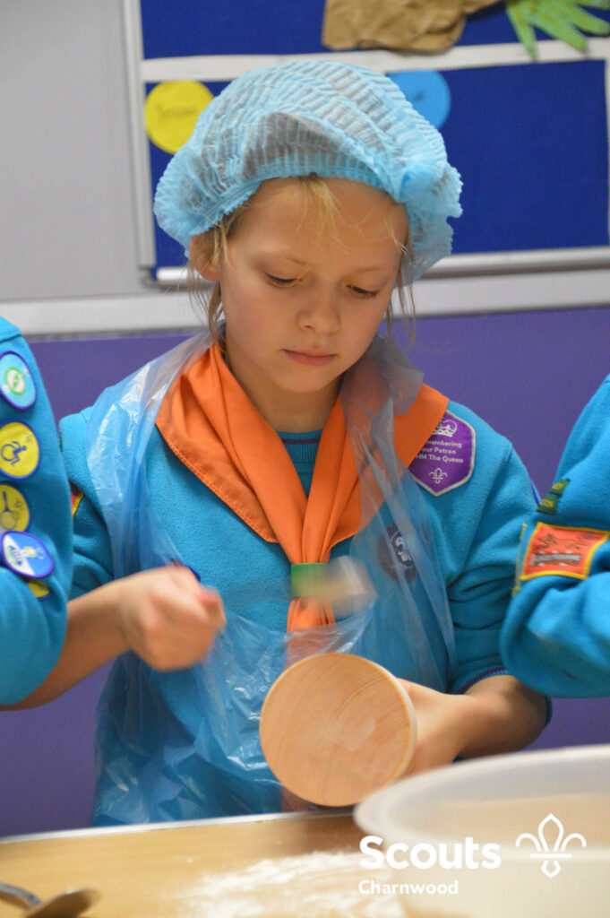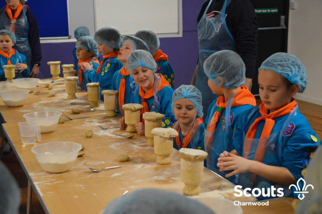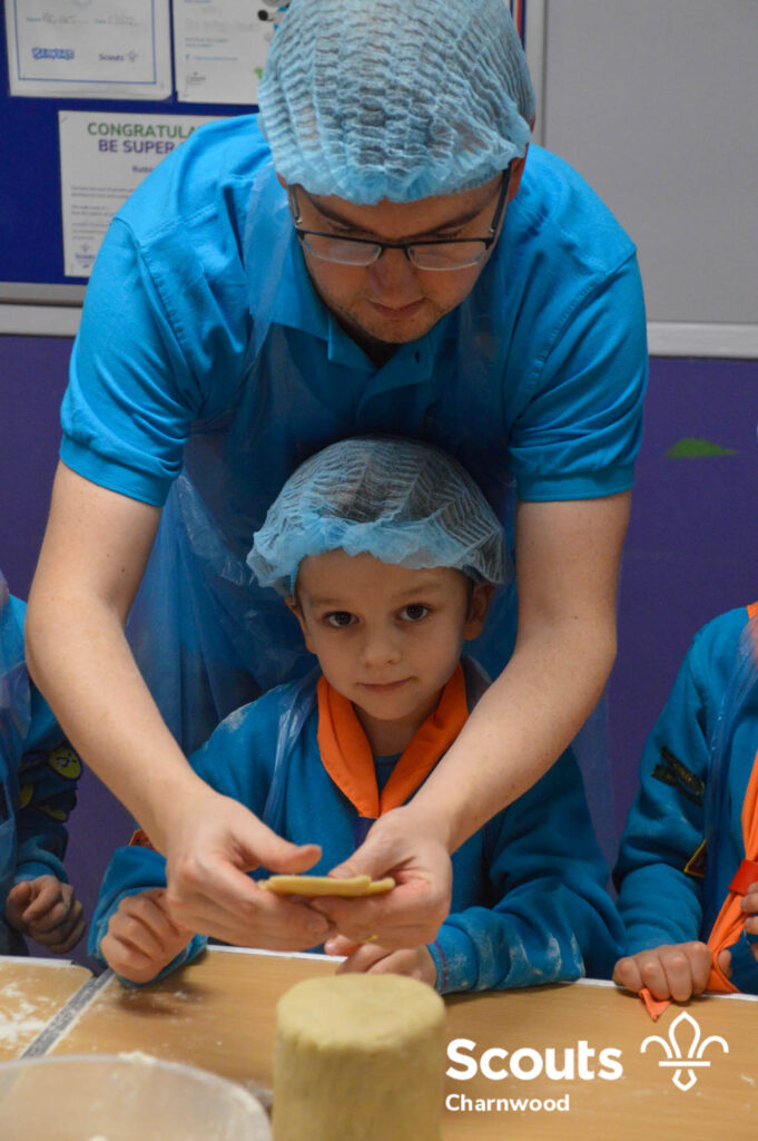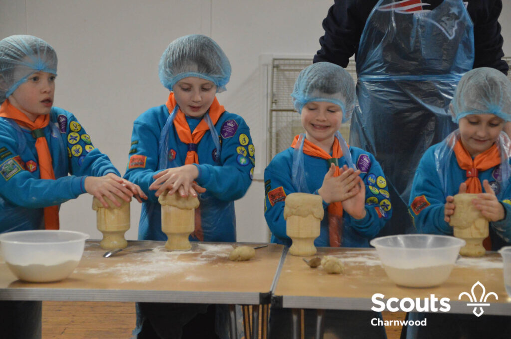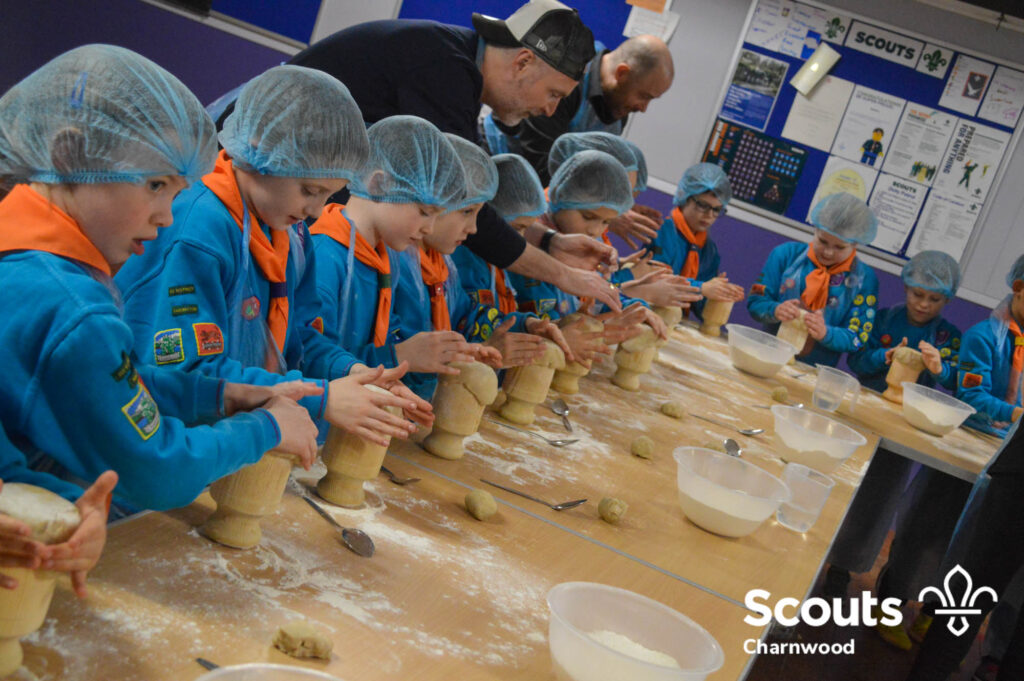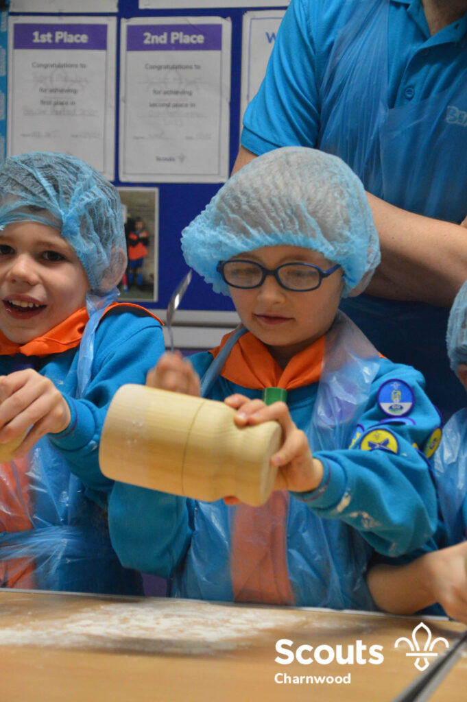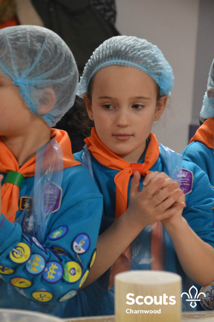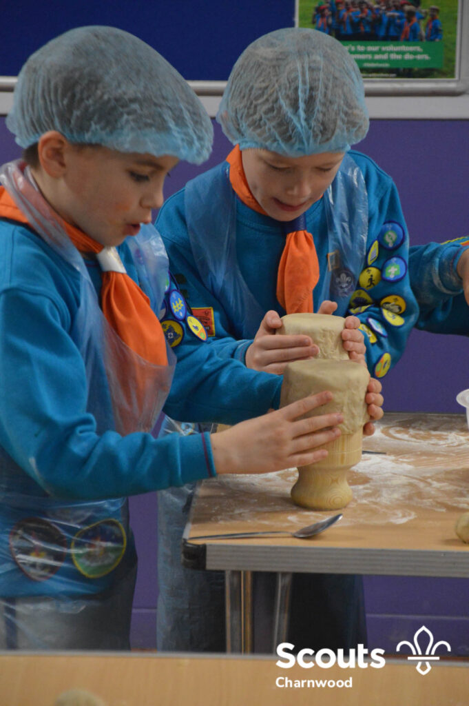 Under the expert guidance of Master Pie maker Claire the Beavers flowered the tables and moulded their pastry around a traditional dolly. Once they had successfully made their pie bases they were filled with local pork from Packington Free Range and pie lids put on.