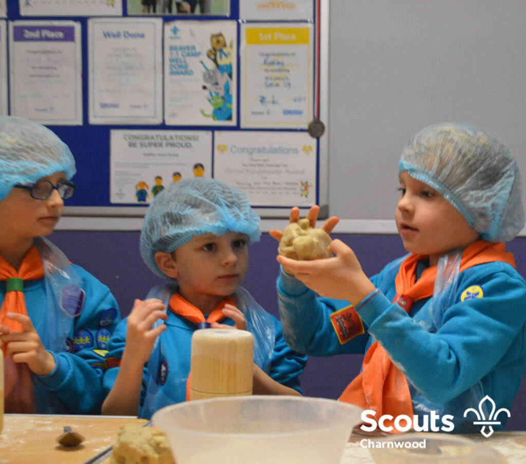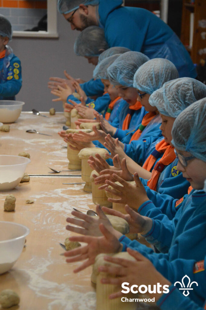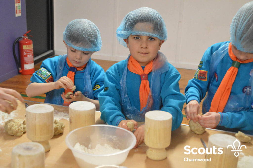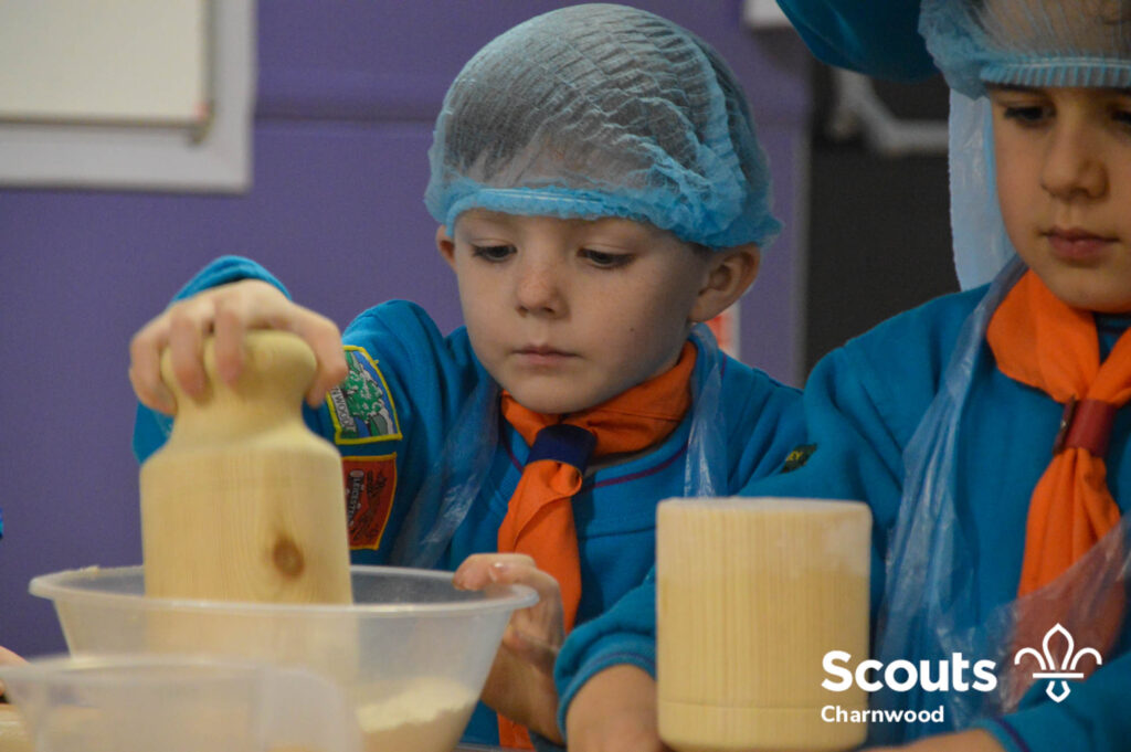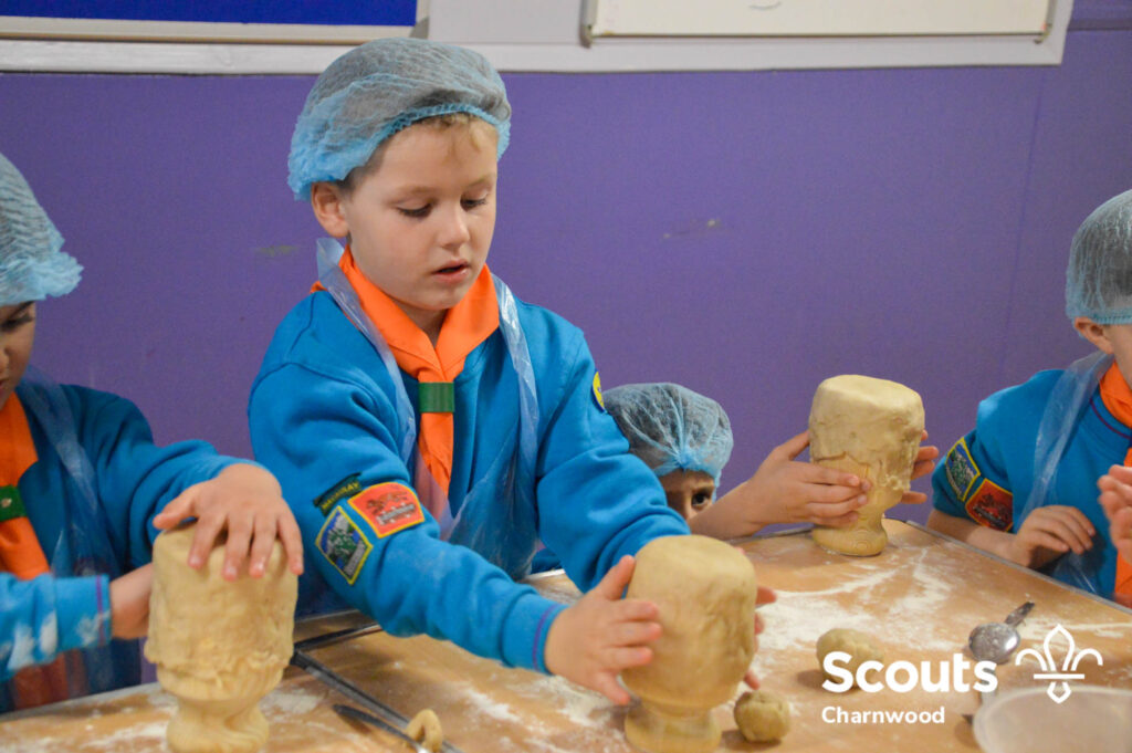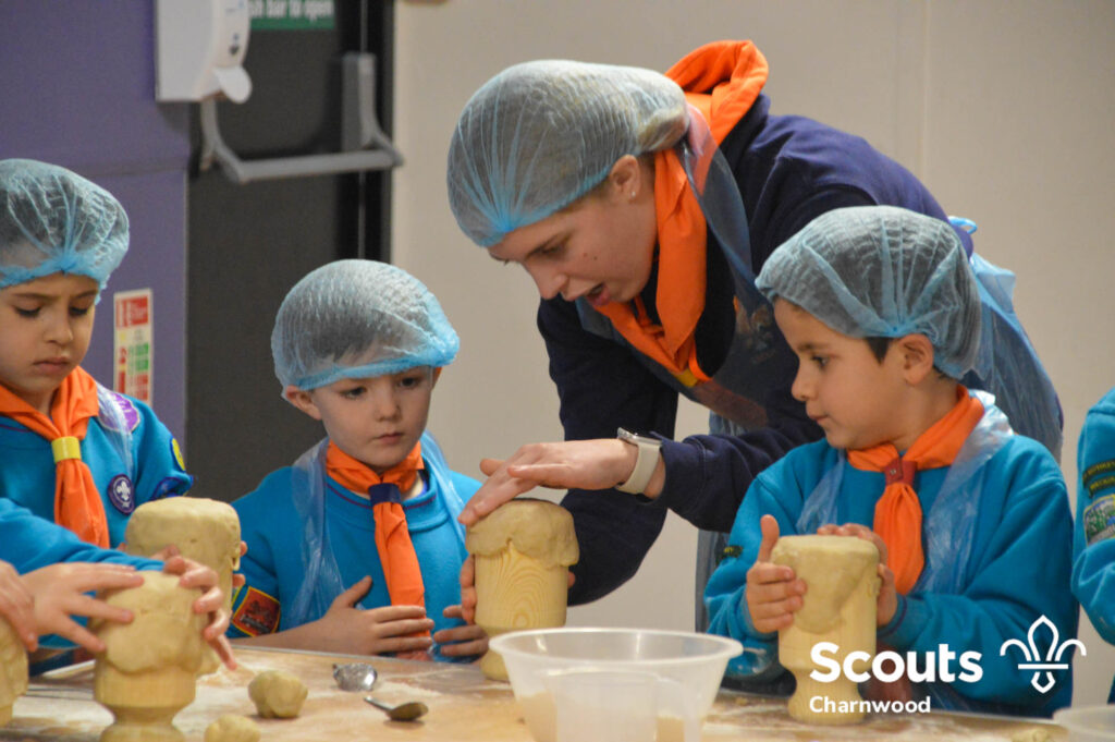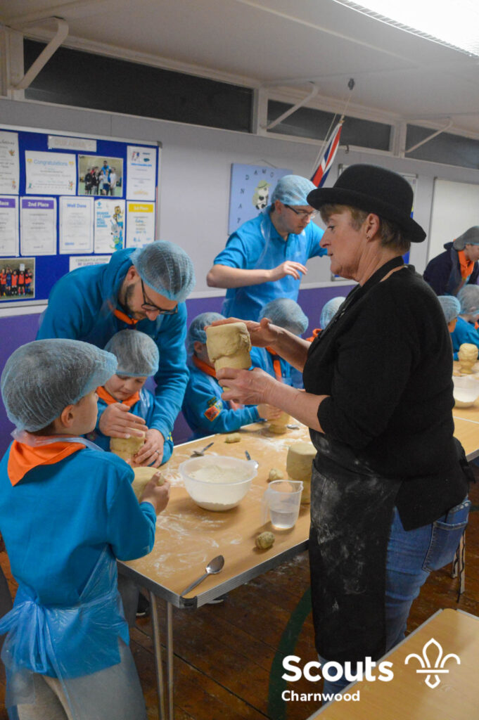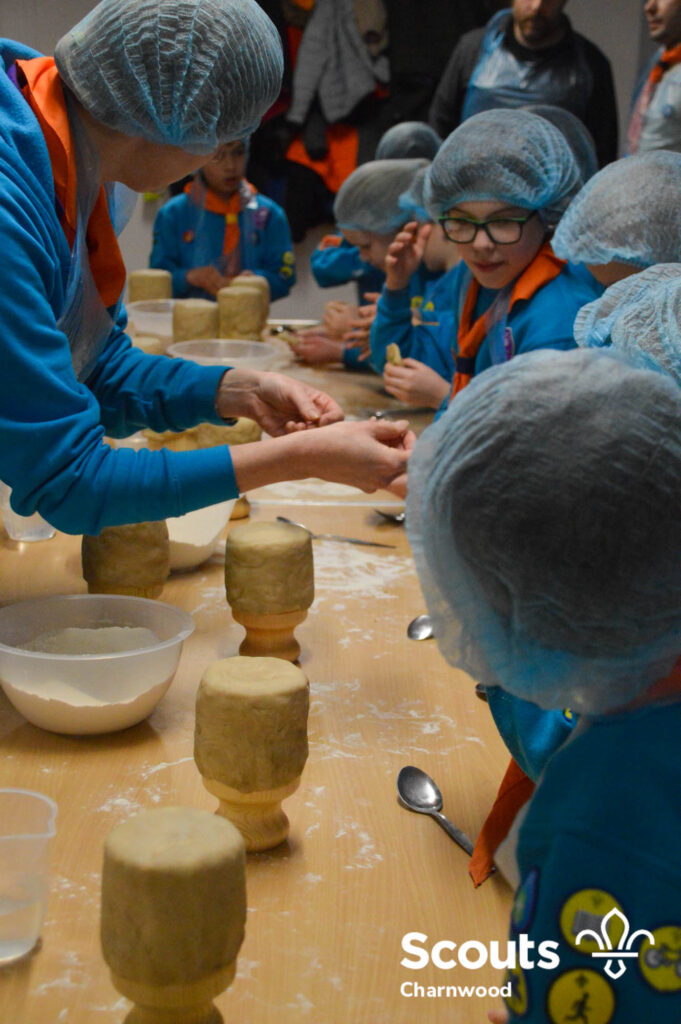 Under the expert guidance of Master Pie maker Claire the Beavers flowered the tables and moulded their pastry around a traditional dolly. Once they had successfully made their pie bases they were filled with local pork from Packington Free Range and pie lids put on.